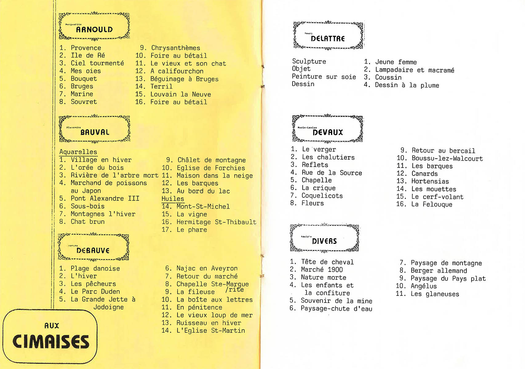 Il est une tradition au Centre Culturel de Souvret de ne jamais solliciter l’avis des critiques d’art. Notre vocation d’éducation permanente qui, heureusement, ne refuse pas les échelons artistiques élevés, doit rester une saine et constante émulation, un encouragement total et non privilégié, bref un accès ouvert à toutes celles et à tous ceux qui se réclament des loisirs éducatifs.